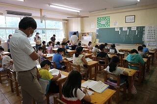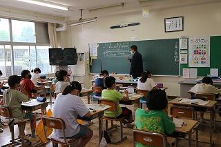 はじめに、資料を見ながら、うさぎの種類、食べ物、習性、体のつくり、お産についてなど、たくさんのことを学びました。「うさぎは何m跳べますか?」と元気に質問する1年生。医師さんの答えは……3m!!びっくりですね。