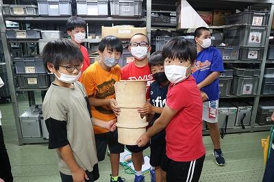 自分達でお世話した朝顔のつるから作ったリースです。リースにつける材料は、だいや川公園や校庭で、拾い集めました。松ぼっくり、どんぐり、木の実。「秋のたから箱」には、1年生こだわりのアイテムが入っています。