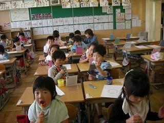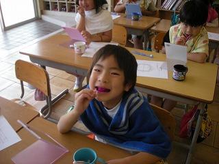 1年生は初めての歯磨き指導。初めてなので、真っ赤なカラーテスターはちょっと気持ちが悪いですね。