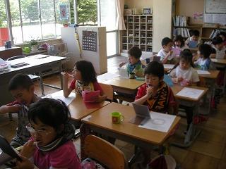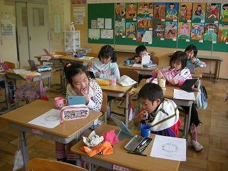 「ミュータンスのすみかをさがす」の紙芝居で、全員ミュータンスのすみかを口の中に作らない決意をして歯磨き開始。