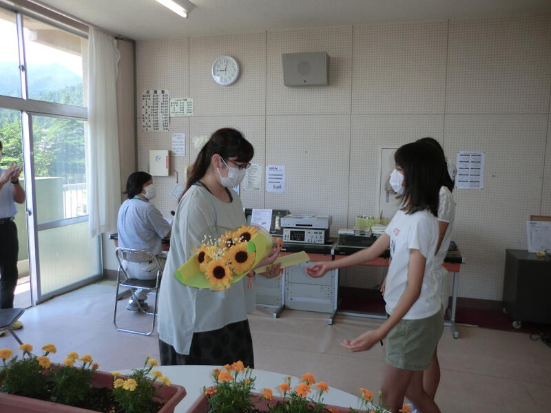 平成29年の8月から令和3年7月31日まで、育児休暇でお休みをしている学校栄養士のM.S先生の代わりとして、本校に勤務されていた学校栄養士のW.K先生とお別れすることになりました。離任式では6年生の児童たちから、お別れのお手紙や花束が手渡されました。長い間、安全・安心な、そして、おいしい給食を提供してくださいました。ありがとうございました。また、児童に優しく栄養指導もしてくださいました。子どもたちも、「命」をいただくことの尊さやありがたさ、また、健康で丈夫な体を作るためには,食事がとても大切なことを学ぶことができました。これからもお身体に気をつけて、お過ごしください。また、日光市学校にも遊びに来てください。