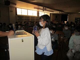 スクリーンの向こうに下府中小の6年生が映し出されると、子どもたちは一気に緊張の顔に!