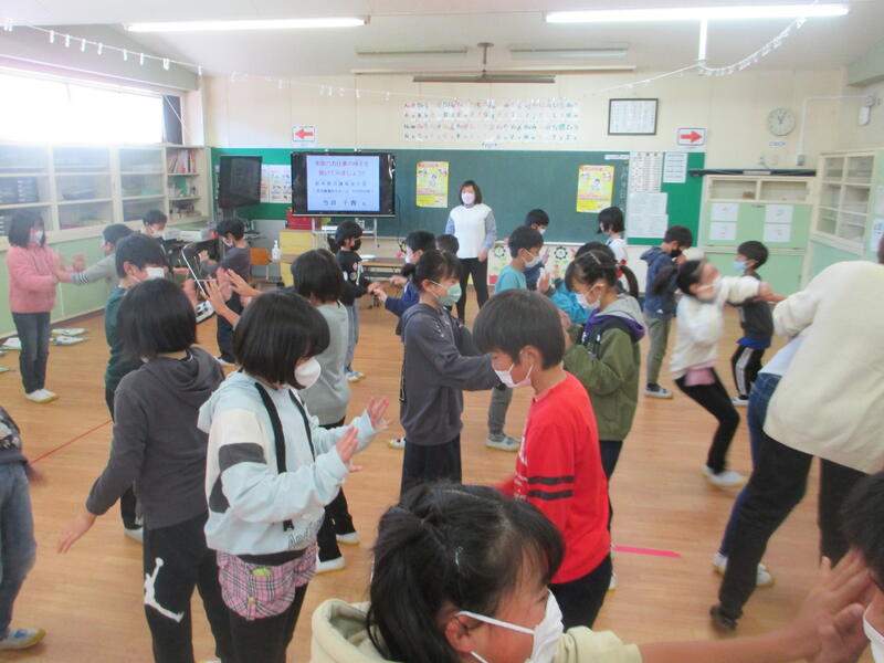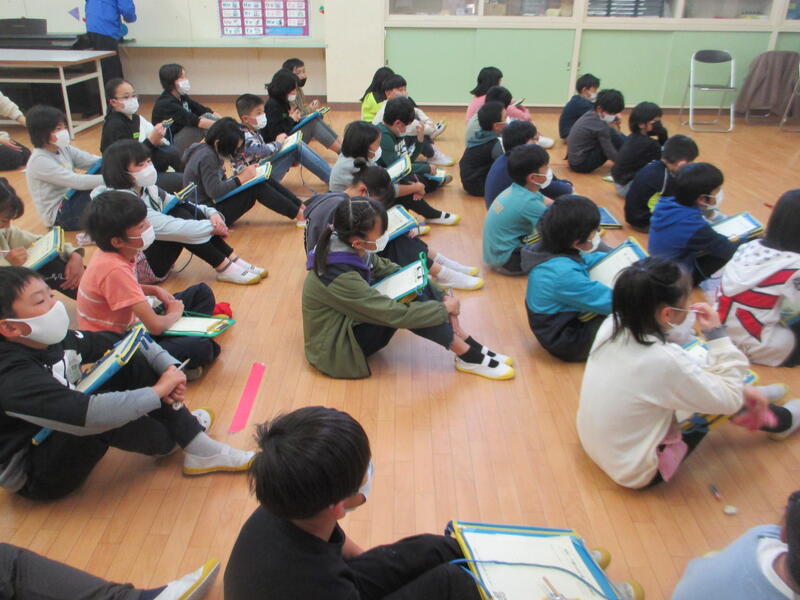 縦割り班遊びの様子を話すと、「あ~同じ!!」という声が聞こえてきたり、校舎に書かれている俳句の話や東照宮の話には感嘆の声や拍手が響いたり。その中でも、「日光小は創立148周年」「校舎から野生のさるやシカが見える」という話には、驚きと大拍手が起こりました。6年生も反応がうれしくて、発表がどんどん上手になり、もちろん下府中小の発表にもナイスリアクションで答えていました。