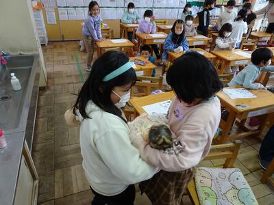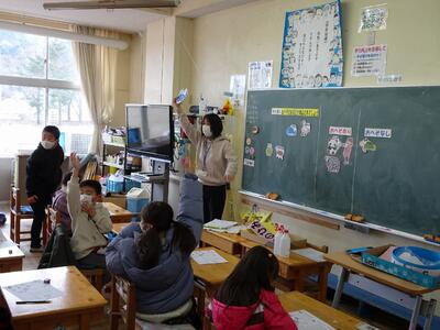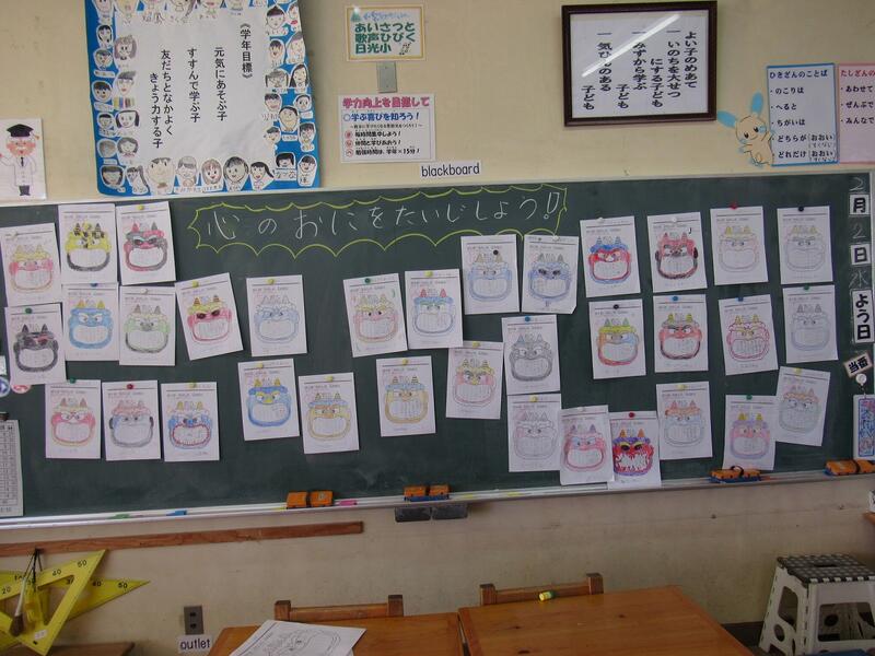 学級活動の時間に、子どもたちは自分の心の中にいる鬼を退治しようと豆まきをしました。事前に自分の心の中にいる鬼を見つけ退治したい鬼を書いた鬼の似顔絵に「鬼は外!」と元気な声で豆をぶつけていました。「宿題をすぐにやらないだらだら鬼」「言うことを聞かない鬼」「牛乳嫌い鬼」「野菜嫌い鬼」など子どもたちがやっつけたい鬼をたいじすることができました。