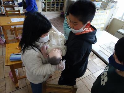 2月16日(水)、「おへそ」をキーワードに、自分たちがおなかの中にいたときのことを想像させながら、命の大切さを知る授業を行いました。 実際に、胎児の重さを粘土で体感したり、児心音を聞いたりしました。最後には赤ちゃん人形(身長50cm、体重3000g)を抱いてみる活動もありました。