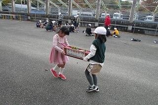 各学級から数名ずつ来て,学級で育てるプランターの花を夏バージョンから冬バージョンに植え替えました。他の児童は,校庭中に散らばっている落ち葉掃きを行いました。