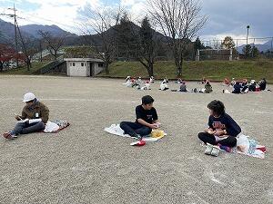 11月11日(金)に野外給食を行いました。もみの木班(1~6年生の縦割り班)ごとに,校庭で輪になって給食を食べました。この日のメニューは,チキンカツバーガー,照り焼きチキン,厚焼き卵,野菜サラダ,みかん,青りんごグミ。山の美しい紅葉を見ながら,美味しくいただきました。