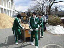 体育館前に杉のウッドチップが山のように。 ボランティアの方が10名。 皆さん木材関係のプロの方ばかり。
