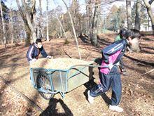1組と2組が2時間づつがんばりました。 木道の材料も運びます。 インパクトドライバーも上手に使えます。