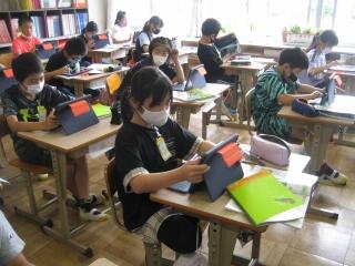 5年生の理科では「天気の変化~台風と気象情報~」の学習をしています。教科書に掲載されているQRコードを各自のタブレットで読み込むと…リアルタイムで雲の動きや天気図を見ることができます。子供たちはタブレット操作にも慣れてきました。