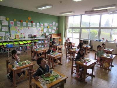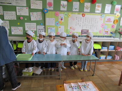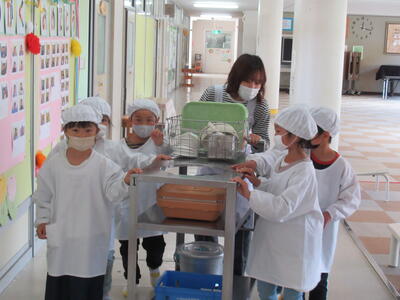 給食も始まり、白衣に着替えて大きなワゴンを給食室からみんなで運び、配膳も行います。