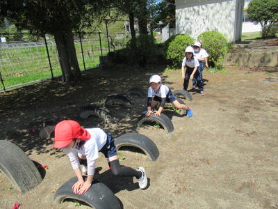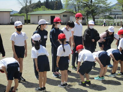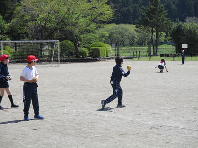 全校生を半分に分けて、今日は、1・6・3年生がサーキットトレーニング、2・4・5年生がボール投げの運動を行いました。