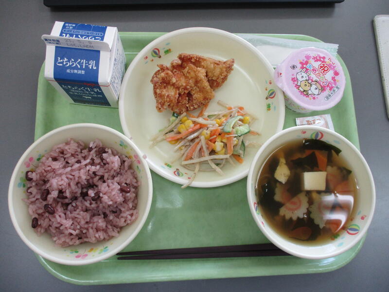 赤飯 牛乳 鶏のから揚げ ごぼうサラダ すまし汁 お祝いイチゴゼリーでした。