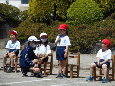1年生が全校生の前で自己紹介をしました。上級生のサポートも素晴らしく、一人一人しっかり言うことができました。