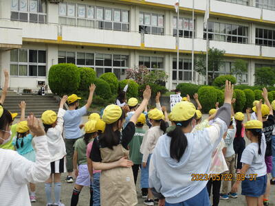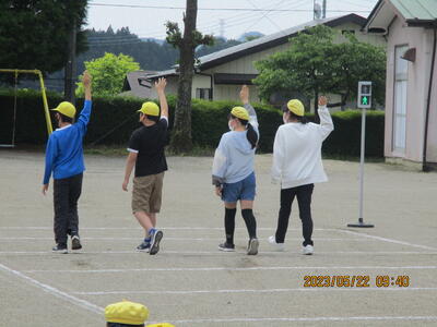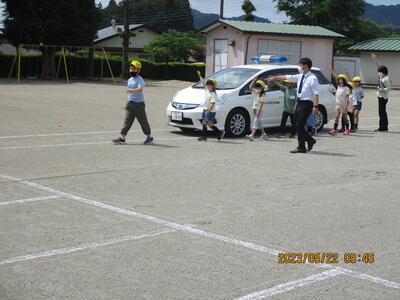 今日(5月22日)は、交通安全教室が行われました。日光市生活安全課交通対策係の皆さんに安全な横断の仕方や道の歩き方を教えていただき、全体で確認した後、登校班ごとに歩行練習(横断練習)を行いました。「確認 右、左、右、前 横断!」の掛け声に合わせて確認します。道の歩き方も狭いところや車が止まっているところなど、ポイントに合わせて、歩き方の練習を行いました。