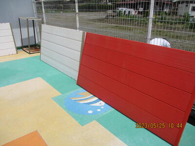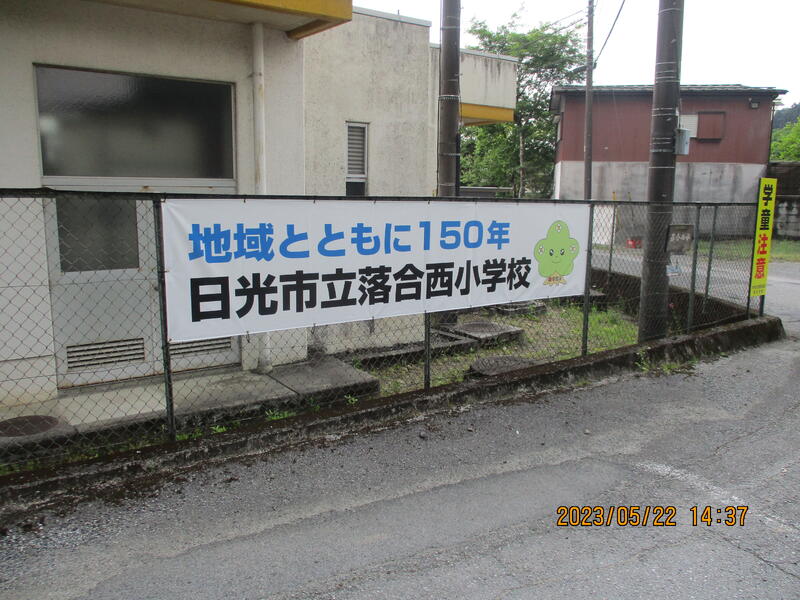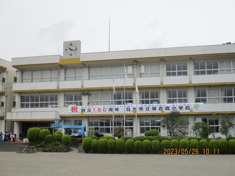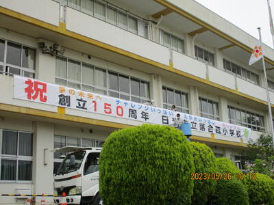 2階のベランダに学校の合言葉「夢の未来へ チャレンジいっぱい えがおいっぱい 楽しい学校」とマスコットキャラクター「ひいらぎちゃん」も一緒に「祝 創立150周年 日光市立落合西小学校」の文字が大きく掲げられました。ちょうど、サツマイモの苗植えから帰ってきた子供たちの目に飛び込んできました。実行委員会の皆さんありがとうございます。