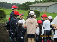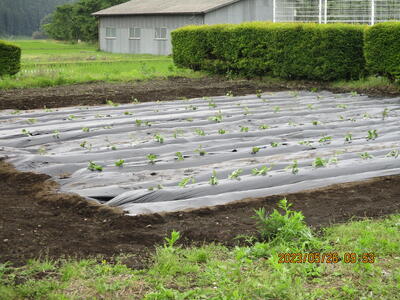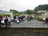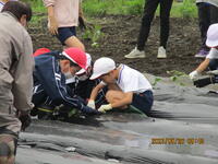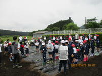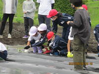 先日3~6年生が畝たてをして、マルチを掛けた畑に5月26日(金)全校生でサツマイモの苗の植え付けに行きました。ひいらぎ班(縦割り班)ごとに苗を植えます。上級生が中心となり、どのように植えるか相談しながら始めました。また、下級生にも寄り添って、植え方を教えてあげています。このあと、どのように育っていくのでしょうか。どの班もたくさんのサツマイモが取れるといいですね。