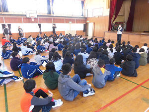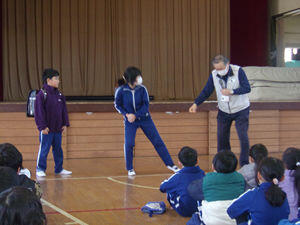 その後は体育館に移動し、スクールサポーターから、不審者と距離を取ることなどを教わりました。