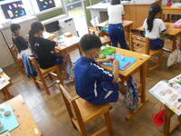 2年図工、粘土を握って感覚を楽しみながら形を作ります。部屋の中や、乗り物など思い思いに作ります。