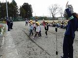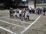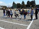 交通安全についてお話を聞いた後、登校班で模擬道路の歩行の訓練を行いました。