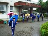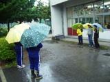 運営委員会の子どもたちが、雨の中、かさを差しながら、昇降口で
