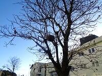 今朝、校舎前で登校指導をしていると、児童の一人が「校長先生、鳥の巣があります」と教えてくれました。学校前の横断歩道のすぐ脇にある街路樹にありました。他の木にもあることを教えてくれました。