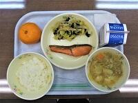 献立:牛乳 ごはん ヤシオマスたまり醤油焼き 磯香り和え かんぴょうの中華風スープ みかん