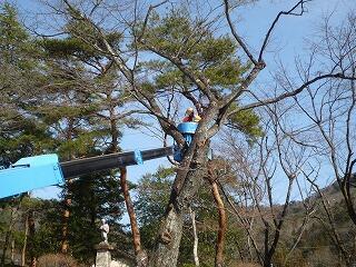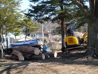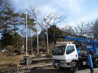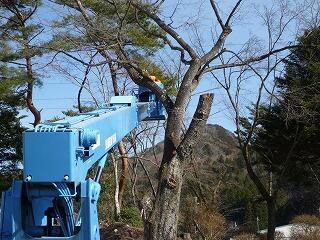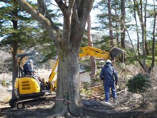 今年度、独立75周年を迎えた本校。その長い歴史を見つめてきた「錦が丘」の木々も老木化し、このところ、強風で枝が折れるケースが目立ってきました。「錦が丘」は、子どもたちの大好きな遊び場ですので、安全確保のために、立ち枯れていた松2本と、桜の枯枝の伐採作業を行いました。