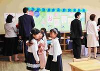 前日、高学年の児童が飾ってくれた教室に、徐々に入学生と保護者の方々がいらっしゃいました。
