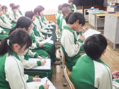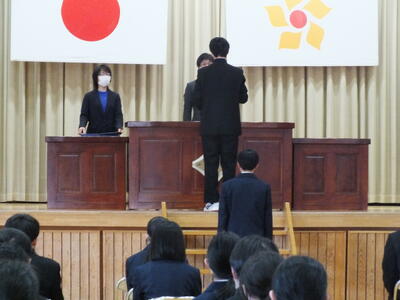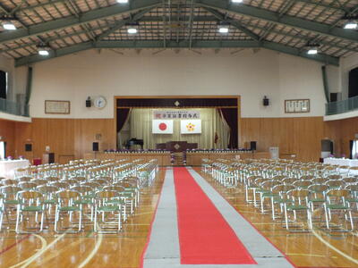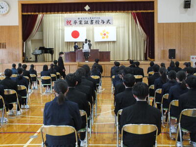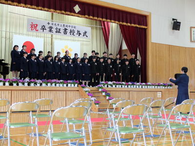 本日、卒業式予行が行われました。卒業生らしい堂々とした入退場、担任の呼名に一生懸命返事をする姿、校歌や式歌を大きな声で歌う姿から、3年間の成長を感じました。1,2年生も姿勢を整え、歌を一生懸命歌い、立派な態度で練習に臨みました。