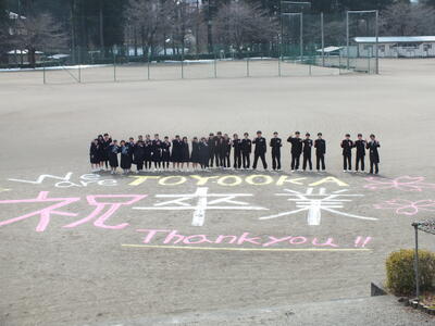 生徒が下校したあと、3年生の卒業を祝う、素敵な校庭アートができあがりました。
