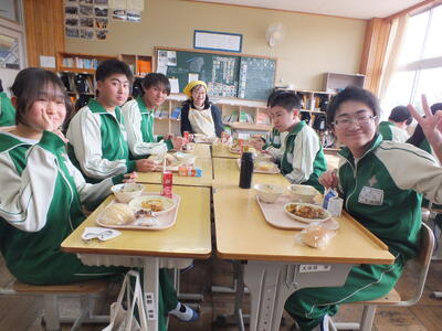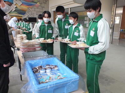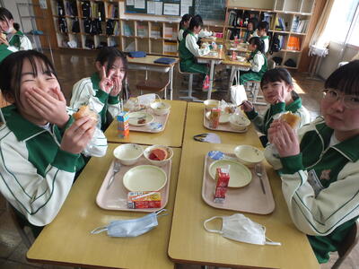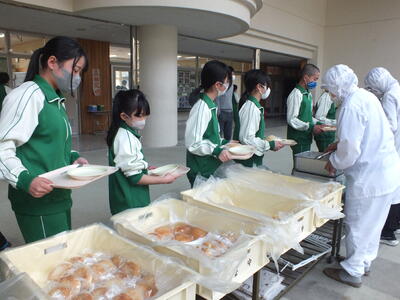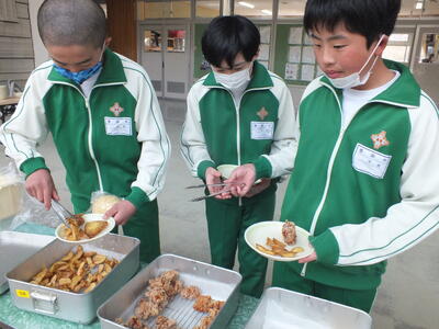 今日は、バイキング給食でした。事前にパンは希望を取り、主菜、副菜、デザート、飲み物はそれぞれ数種類の中から自分の食べたいものを選びました。バイキング給食だと、いつも以上に楽しく食べられるので、今回も1,2年生全員で全部の料理を完食しました。