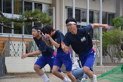 次の時間は、中学生全員での体育です。ベースボールを試合形式で一緒に楽しむことができました。