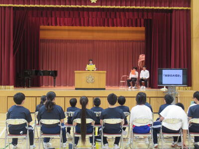 その後、本校スクールカウンセラーの先生から、ゲーム依存についてお話をしていただきました。カマキリとハリガネムシの関係を例えに、ゲームに依存していく過程や、ゲーム依存症の症状などの説明、予防のための手立てなどについて、とても分かりやすくお話をしていただきました。