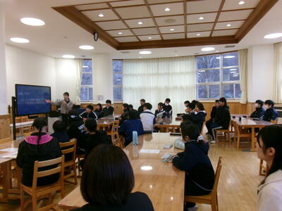その後、本校スクールカウンセラーの先生から、ゲーム依存についてお話をしていただきました。カマキリとハリガネムシの関係を例えに、ゲームに依存していく過程や、ゲーム依存症の症状などの説明、予防のための手立てなどについて、とても分かりやすくお話をしていただきました。