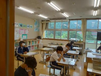 7月22日(月)に夏休みのサマースクールがありました。22日(月)と23日(火)の二日間、地域のボランティアの皆様を講師に、子ども達へ習字と工作の指導や支援を行っていただく教室です。第1日目の今回は6名の地域ボランティアの皆様にお世話になり、小学生、中学生に分かれて、習字の教室を行いました。