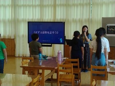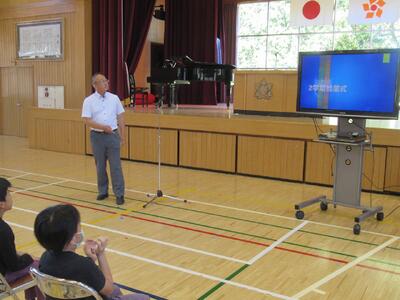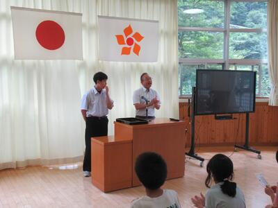 児童指導主任から、夏季休業中の生活や安全面について話をしました。1年生から9年生まで年齢差のある子ども達全員が理解できるよう、画像を使って分かりやすく説明しました。
