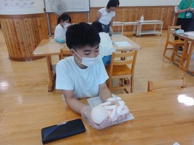 7月17日(水)に5・6年生が、今年度初めての調理実習をしました。5年生は身支度や手洗いの確認と、お湯の沸かし方、卵のゆで方を身に付けることをめあてに、6年生はジャガイモの洗い方と、芽の取り方、ゆで方を身に付けることをめあてに学習しました。