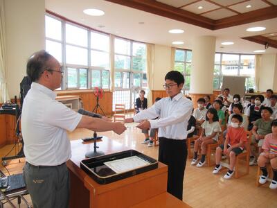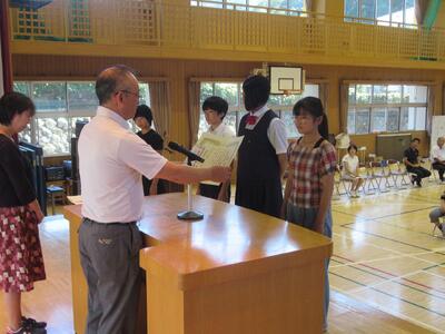 終業式は校長からの話、児童生徒代表の発表等を行い、終了後に各種表彰と夏季休業中についての話がありました。校長からは、1学期と児童生徒の成長を画像で振り返るとともに、夏季休業に向けて、宮本武蔵の「我事において後悔せず」の言葉から、いろいろなことにチャレンジしてほしいとの話をしました。