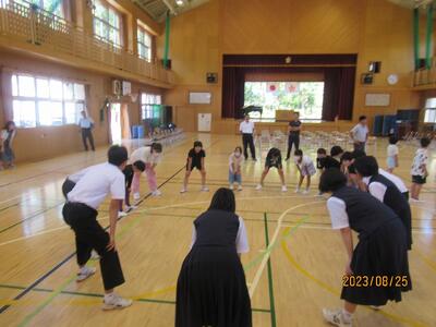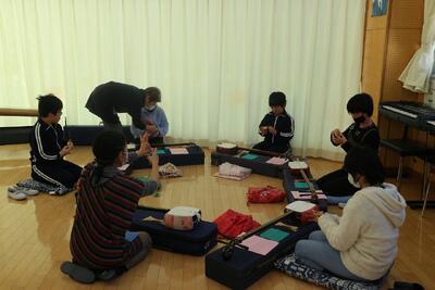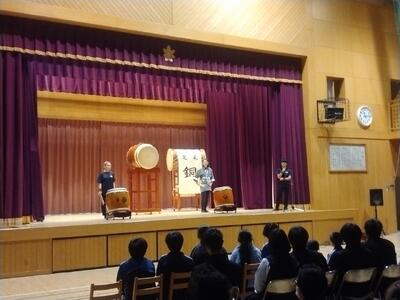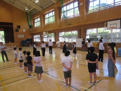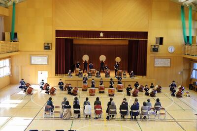 1学期間、毎週取り組んできた全校児童生徒による太鼓活動と中学生による合唱活動が今学期最後の活動となりました。本校の特色ある活動であり、伝統ある太鼓活動を通して、子ども達が互いに「考え伝え合える力」「自他を理解する力」「向上心」などの本校の目指す資質・能力を育成するとともに、多くの方々の前で発表する機会を通して、自信を持って物事に取り組んだり、自己有用感を育んだりすることにもつながっています。1学期は運動会や東小との交流会で披露することができました。ボランティアの方のご指導の下、1学期もさらにレベルアップできるように、全員が心をひとつにして練習に取り組んできました。