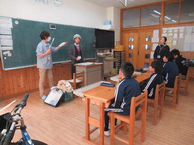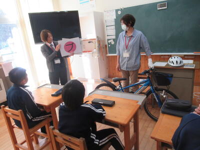 自転車事故になる事例や交通ルールを守る大切さについて動画で学んだ後、ヘルメットの正しい着用の仕方や自転車整備の「ブタはシしゃベル」について教えていただきました。