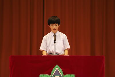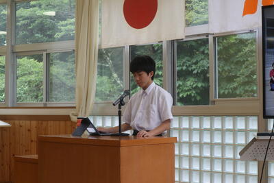校長のあいさつ後、新生徒会長から代表のあいさつを行いました。