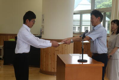 続いて、新役員となった3名の生徒の任命式です。一人ひとりに任命証を渡します。