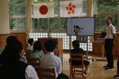 小学校教頭先生の話は、「あいさつ」についてです。本校の子ども達が今よりもっと、あいさつが気持ちよくできるようになってほしいとの想いをこめて、あいさつの良さや大切さについて話しました。また、あいさつを全校児童生徒がさらにできるようにするために、「あいさつ広め隊」を結成し、7人の児童生徒を任命しました。