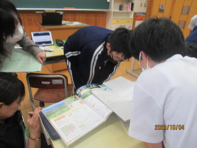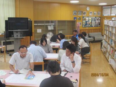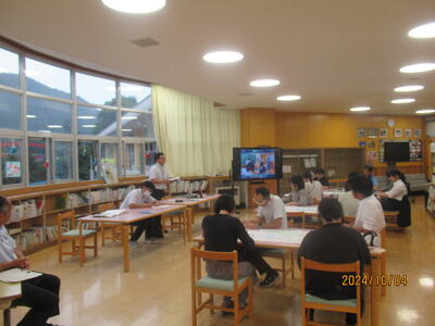 研究授業後に、本校の研究主任から、今までの取組の様子と成果や課題について説明をしました。また、指導主事と参観の教職員、本校職員で授業について話し合いを行いました。