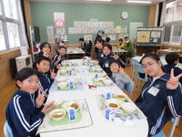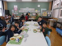 給食の時間には、小学生・中学生みんなでランチルームで食べました。牛乳を開けるのを手伝ったり、片付け方を教えたり、小学生がお兄さんお姉さんに見えました。