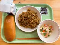 牛乳、ミルクパン、ソフトチョコ、いも入り焼きそば、カリコリサラダです。