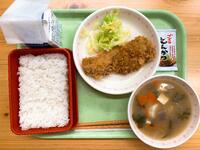 学校給食週間4日目の給食献立は、ご飯、牛乳、とんカツ、ボイルキャベツ、ごまソース、にこにこ汁でした。