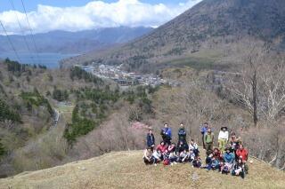延期されたお陰で、満開のシロヤシオも見ることができました。今年も鉄塔付近で中禅寺湖や華厳の滝、男体山を背景にみんなで記念写真を撮りました。
