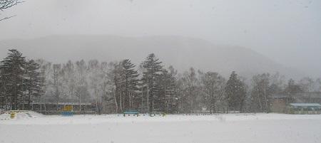 12月19日(水)午後、雪が降りました。週末に雪が降ることがありましたが、授業日では今シーズンの初雪です。校庭を囲む白樺林と舞い散る雪が織りなす光景は、水墨画のようなモノクロの世界。所々の遊具の色がいつになく映えて見えました。